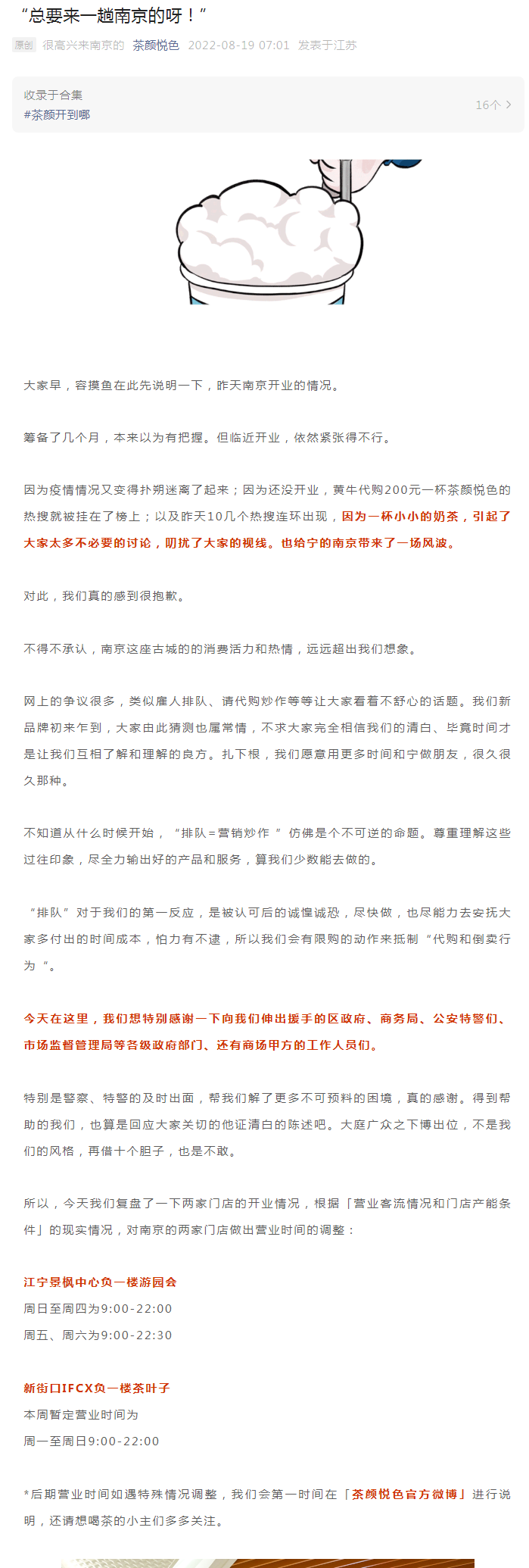 同時(shí),茶顏悅色將根據(jù)營(yíng)業(yè)客流情況和門(mén)店產(chǎn)能條件的現(xiàn)實(shí)情況,對(duì)南京的兩家門(mén)店做出營(yíng)業(yè)時(shí)間的調(diào)整。